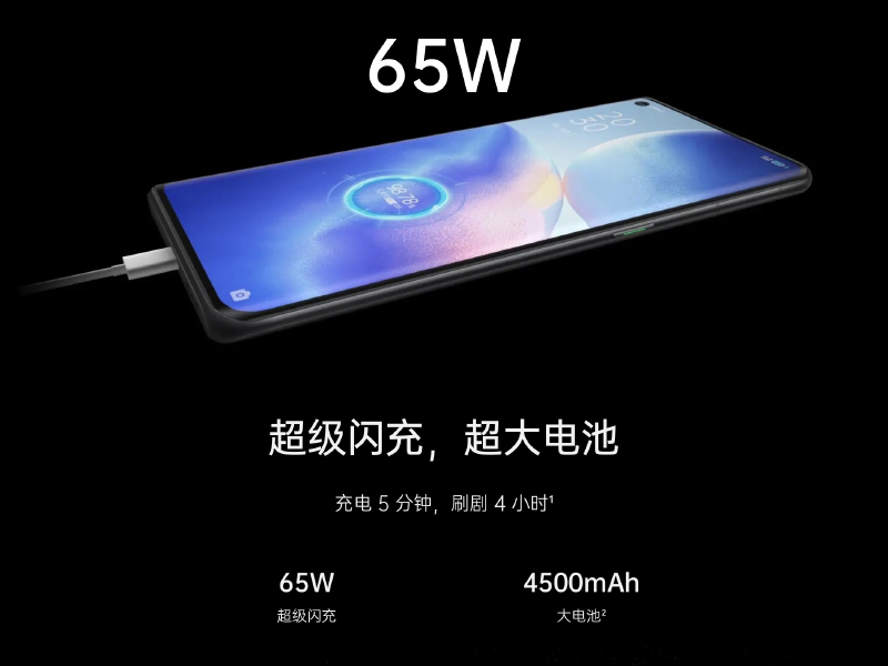 電量方面, Reno5 Pro+ 4500mAh 大電量電池,支持 65W SuperVOOC 2.0 超級閃充、VOOC 3.0、18W PD、 18W QC 快速充電協議: