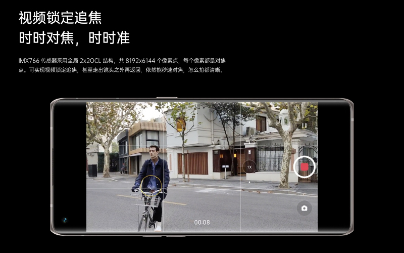 SONY IMX766 感光元件採用 2x2OCL 結構、共8192*6144 個點,每個指向都是對焦點。可實現錄影鎖定追焦,甚至走出鏡頭之外再返回,依然能秒速對焦。