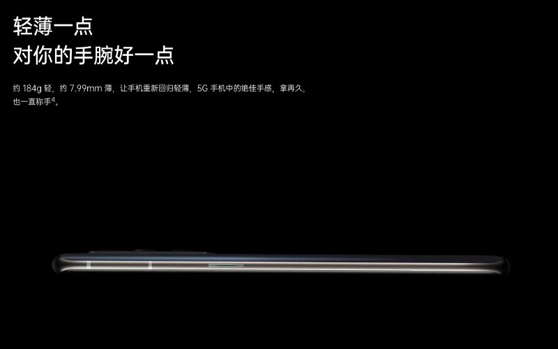Reno5 Pro+ 也擁有輕薄的機身,機身重量僅 184g 、機身厚度僅有 7.99mm :