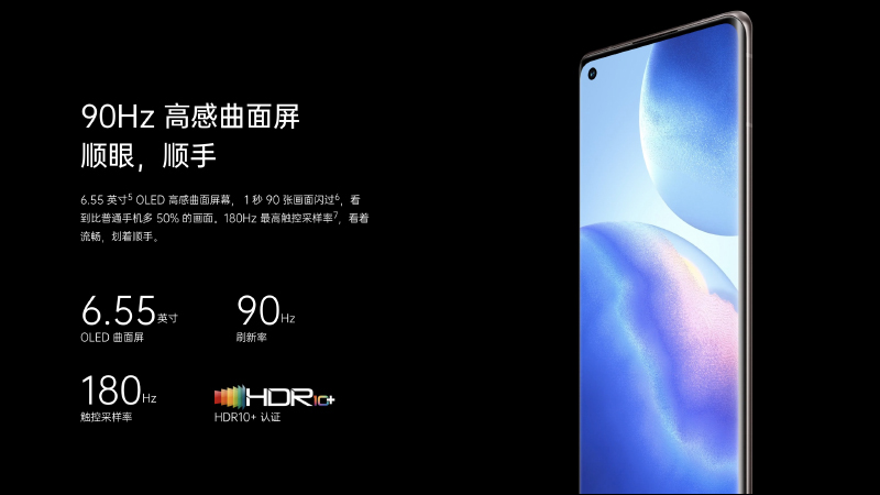 Reno5 Pro+ 採用 6.55 吋 90Hz 更新率的 OLED 曲面螢幕,螢幕符合 HDR10+ 認證、亦支持最高 180Hz 觸控採樣率。