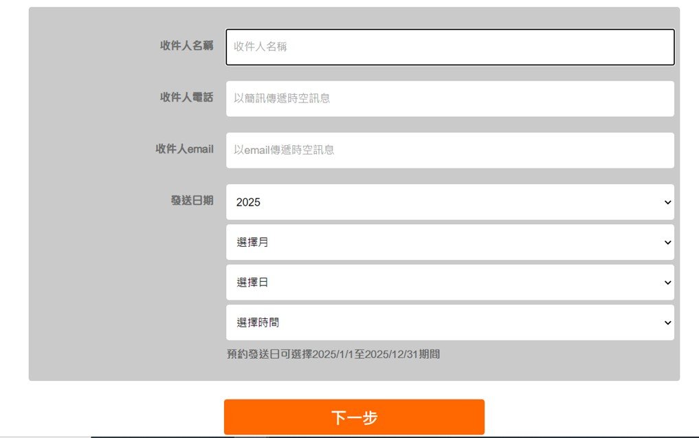 F.輸入寄件人名稱與預計發送時間,點選【下一步】。