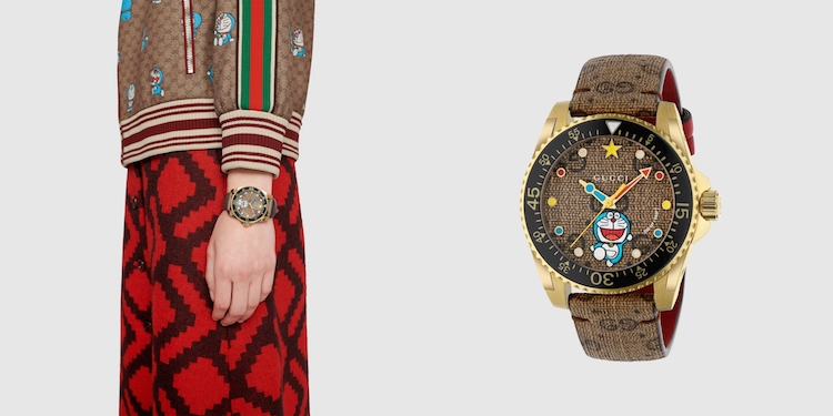 Gucci的錶款相比於許多同等精品來說在價錢上是非常好入的!這款以金色編框搭配 GG Logo 設計的錶款,在哆啦 A 夢的加持下變得格外可愛!指針及時間的刻度,更多用多彩的方式互映人物的色彩,極富細節的設計讓人過目難忘。