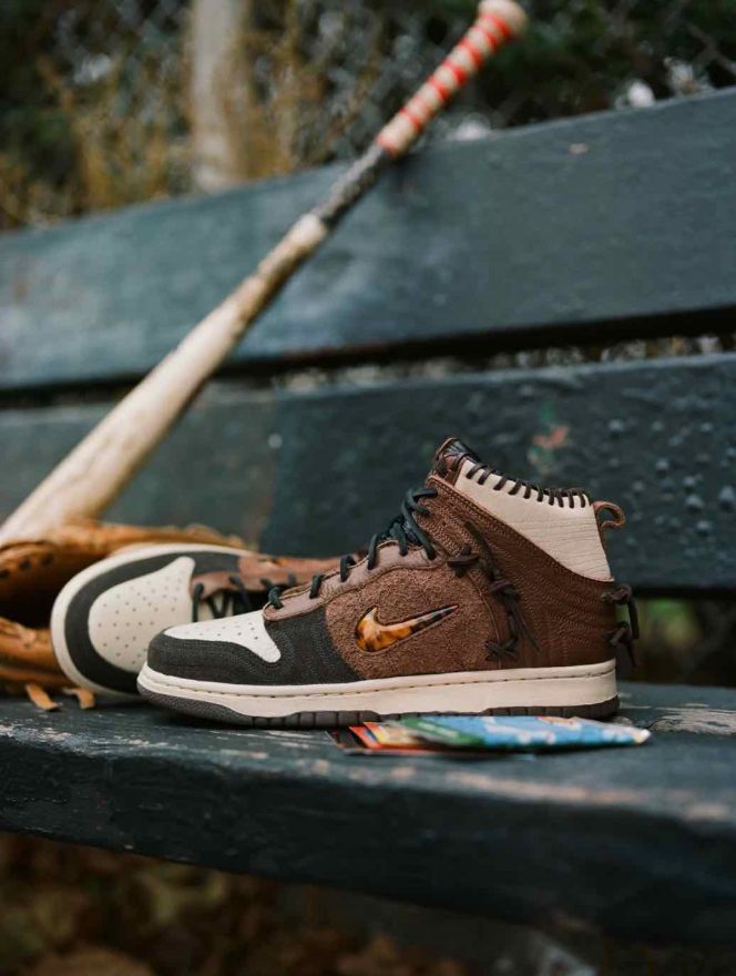 Nike x Bodega Dunk High SP ‘Legend’ 在形象上,是以復古風的棒球下去設計,鞋款刻意用粗糙的方式呈現,以多種材料拼接,並且搭上了外露縫線,來表達出棒球手套的意象。