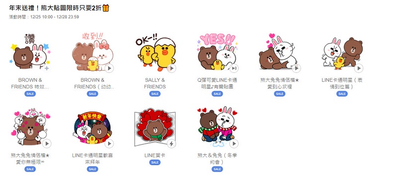 「年末送禮!熊大貼圖限時只要2折」活動,活動時間從12月25日 10:00 – 12月28日 23:59,全部2折12元。