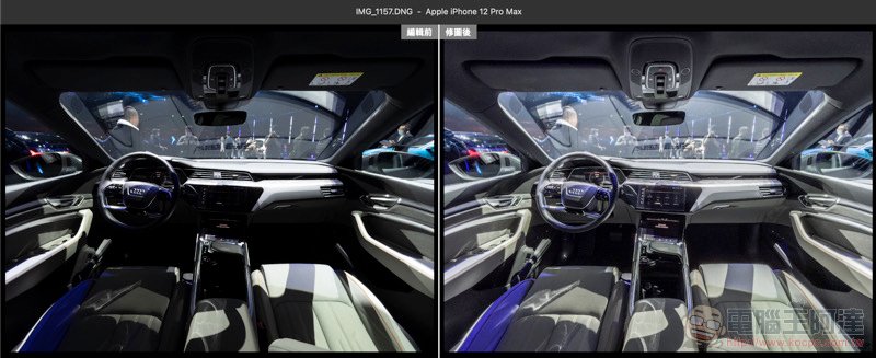 有意思的是,在更新完 iOS 14.3 後首場上陣的記者會,剛好遇到的是拍攝光線條件相當差的車廠發表會。但也因為遇到了這種極端的條件,發現 ProRAW 綜合了運算攝影後的能耐,真的已經跨入專業領域了。