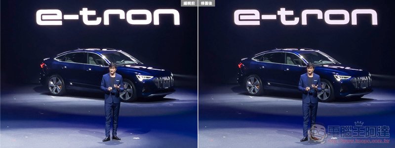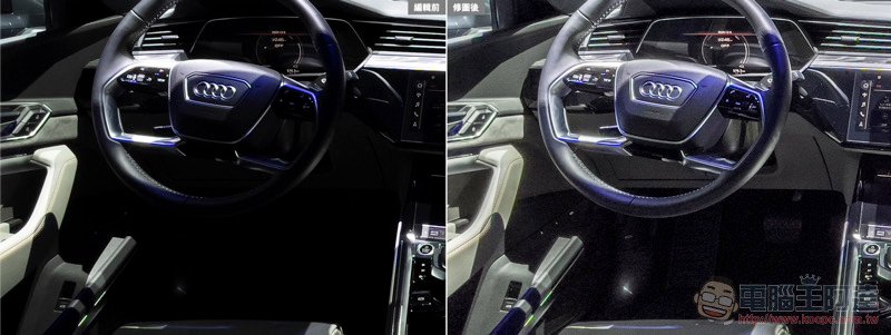 基本上左邊都還算接近修圖前 iPhone 拍攝時看到的樣子。雖然應該會有人說,這在拍攝的時候為什麼不盡量拉得更亮一些。我只能說,現場不僅光源真的就像「編輯前」這樣對比高又複雜到爆,就連想要賞車的媒體人潮也是,基本上很難在那邊慢慢調整曝光再拍。