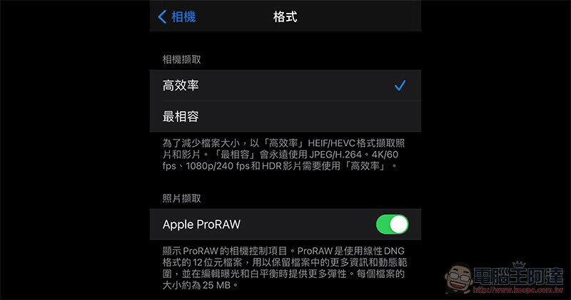 ▲圖:升級 iOS 14.3 後就可以在相機功能中開啟 RAW 格式。