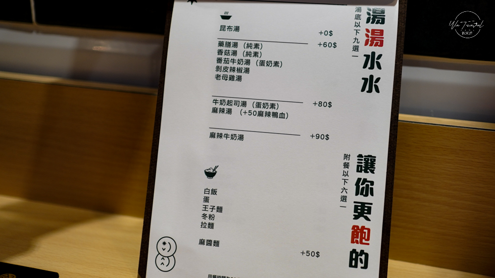 除了主餐跟湯底,選擇後有六選一的附餐:白飯、雞蛋、王子麵、冬粉、拉麵,若要比較特殊的麻醬麵要再加價NT.50
