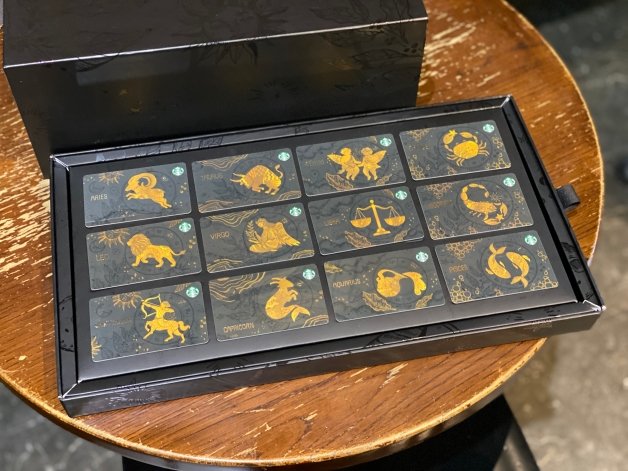 除了12星座馬克杯之外,這次還特別加碼推出整套12張的「12星座隨行卡系列」,跟馬克杯組一樣,以「星巴克咖啡豆包裝圖騰」為基底,輪到該星座月份時,後面輪盤上的星座圖案會轉到兩點鐘方向並亮起該星座圖案!
