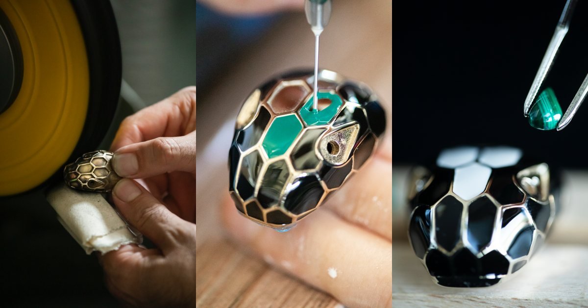 不知道妞妞們有沒有發現,其實寶格麗在包款與配件上所使用的蛇頭扣環,都是以珠寶等級的工藝打造,而且陸續有過幾次外型上的演變,在2021春夏包款上所使用的嶄新蛇頭造型是受到1960年代蛇形珠寶的啟發,再融入骨董珠寶元素,而蛇頭釦環上的六角形鱗片漆上多色琺瑯釉彩,最後鑲嵌上炫目的寶石蛇眼,從外型、材質到色澤都非常精緻。