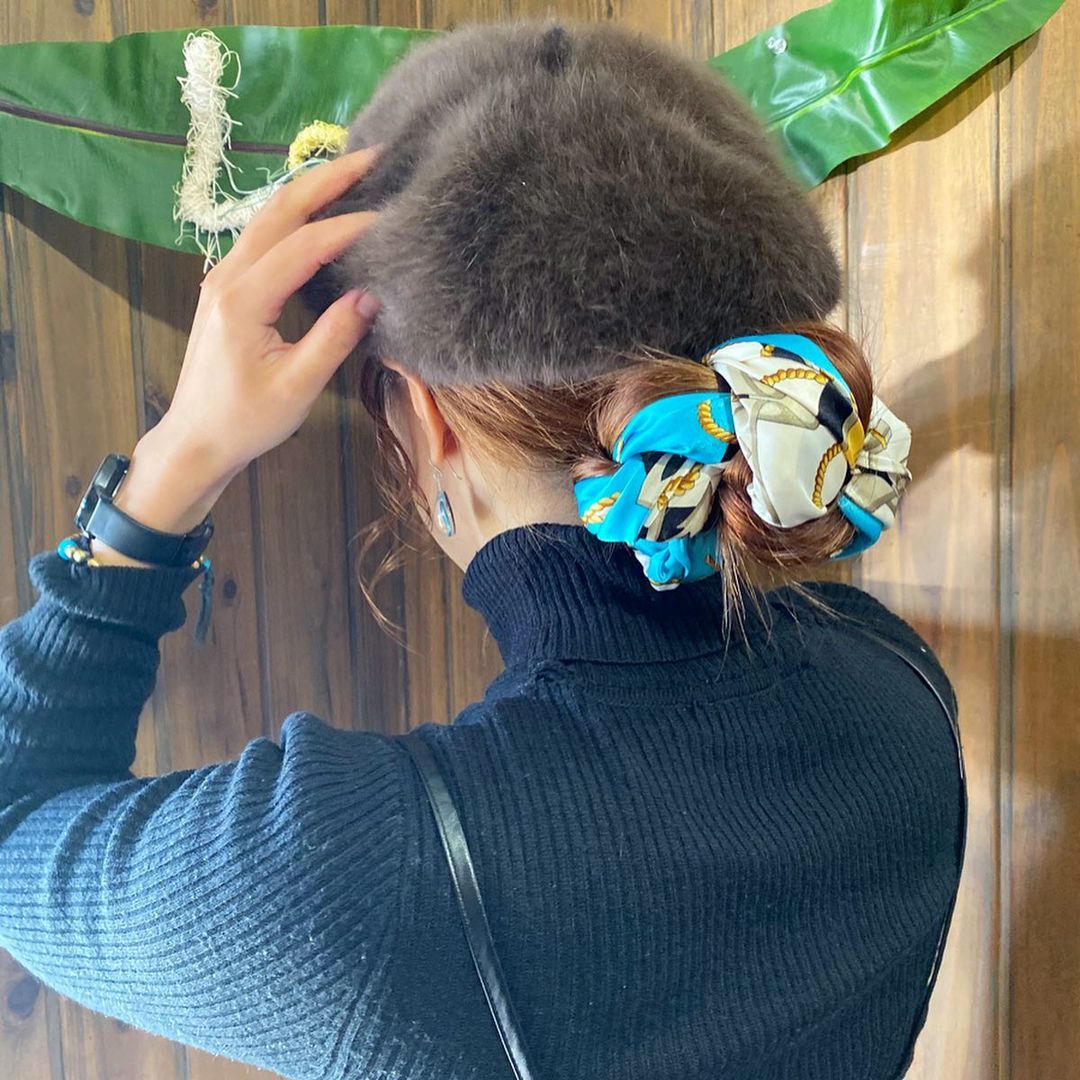 首先紮出一個低馬尾,且戴好貝雷帽,接著將絲巾串上馬尾上的髮圈,並以雙股辮的方式纏繞在一起,最後再將辮子繞成包頭,用絲巾打一個蝴蝶結固定即可完成,造型簡單快速卻又充滿細節感!不過在絲巾的挑選上建議選擇軟質料、長度長的款式會更好上手喔!
