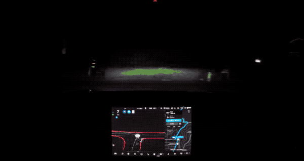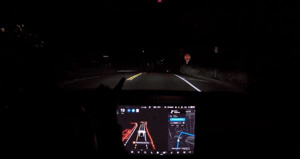▲圖:上坡時視覺會容易被人給忽略的地上標示,還有短暫出現在大燈照射範圍的停止標示,都被 FSD 系統給確實偵測且對應。(來源:Vincent Yu)