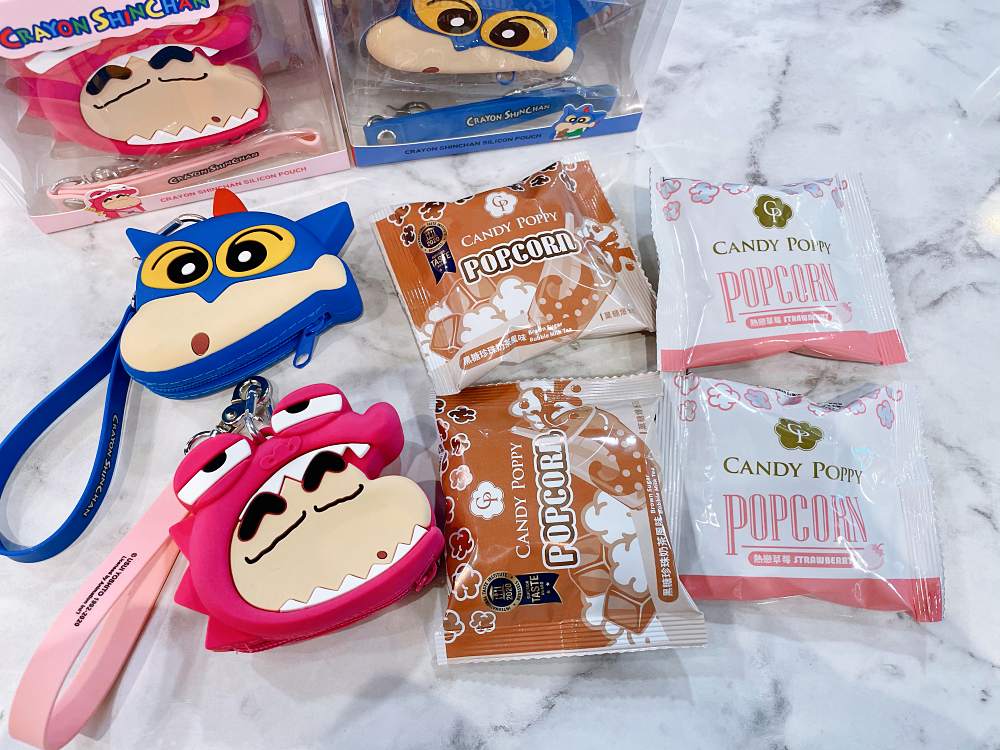 《蠟筆小新》週邊則有以動感超人、粉紅鱷魚為造型的零錢收納包,每款週邊隨附果糖爆米花,讓粉絲可以跟著野原新之助一起「吃甜甜」。(笑)