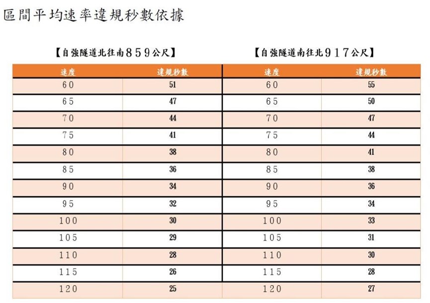 在實施測速路段內必須依速限規定行駛,因速率係以平均值認定,故偶然不慎超速應不至於立刻構成違規,後續再注意減速即可,亦即存有補救之機會(固定桿則無)。以下是以台北市自強隧道通過的秒數換算車速。