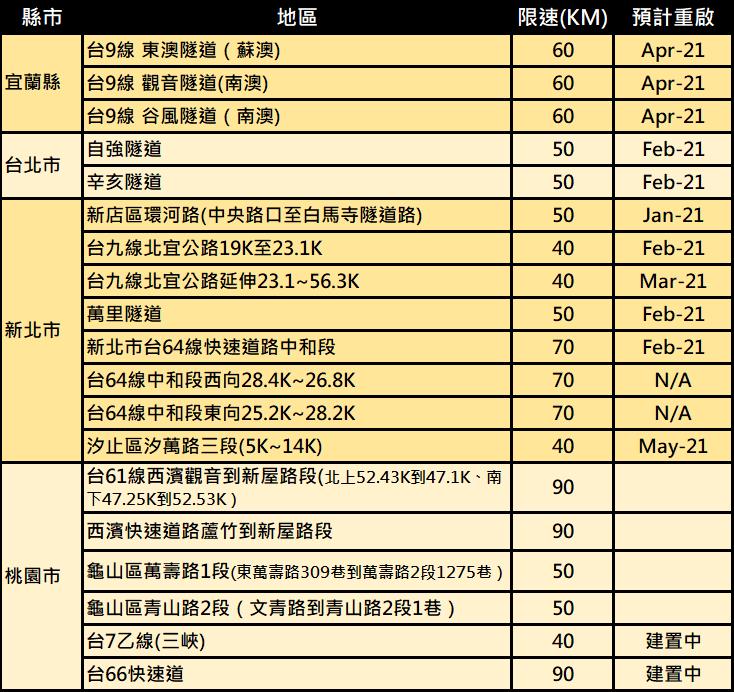 PS: *苗栗兩路段夜間8時至隔日6時降為50公里