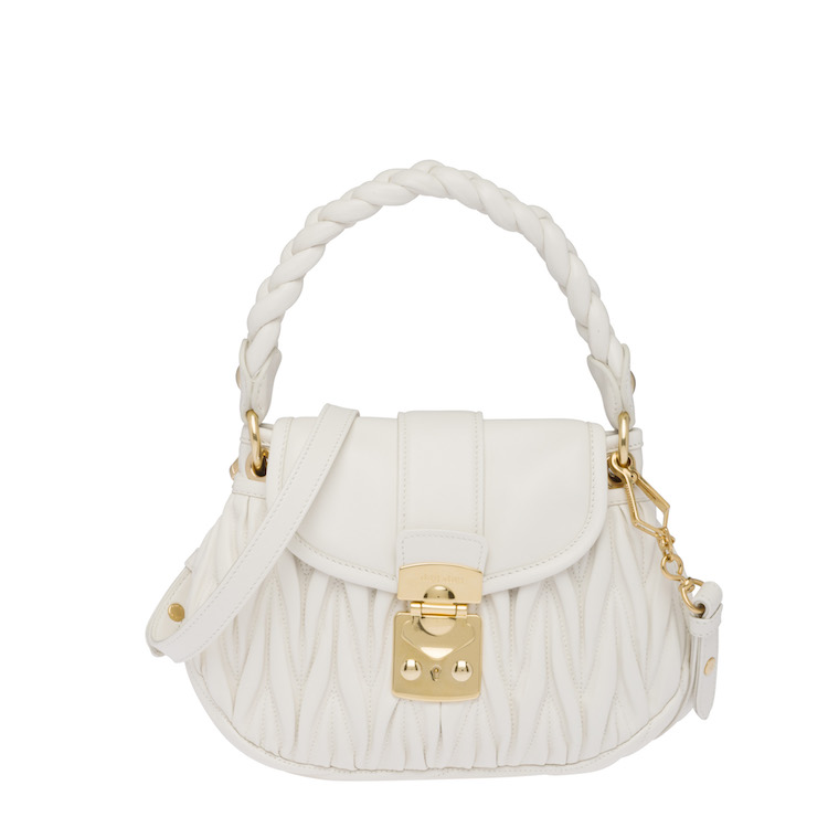MiuMiu 是一個能讓重拾少女心的品牌!這款出自於 2021 年早春包款,用半月型手提的方式呈現,並加入品牌經典的抓皺設計,讓包款整體能呈現可愛且細緻的樣貌。(價格店洽)