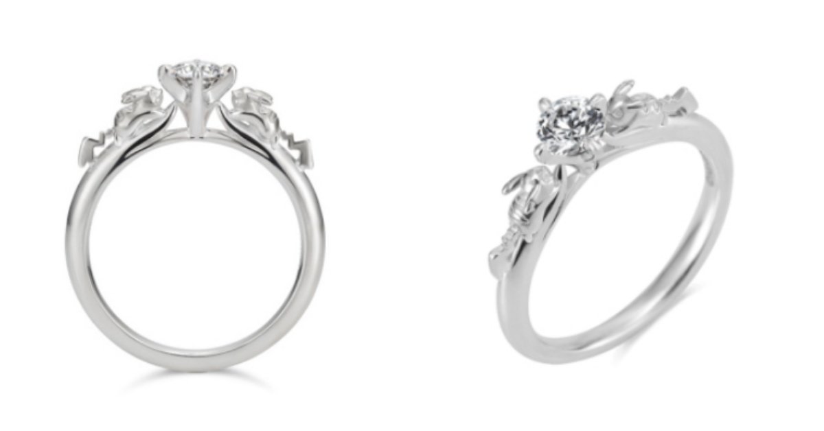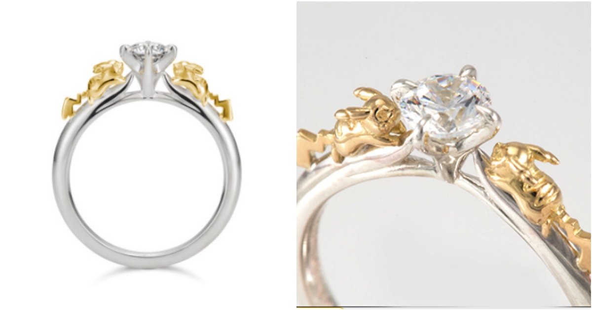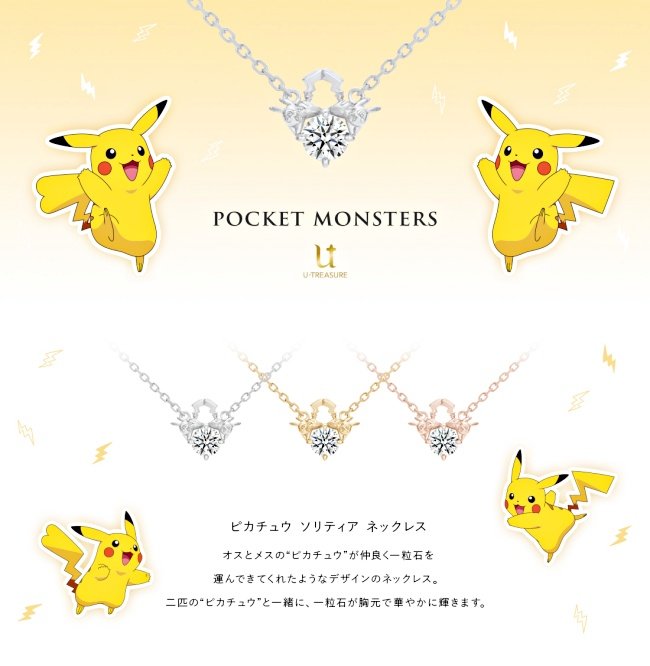 U-TREASURE也曾推出過「皮卡丘聯名婚戒」,戒指的正中央裝飾著耀眼水鑽,皮卡丘分別在兩旁登場,光芒四射的鑽石彷彿有著不知名魔力,引導著皮卡丘向著它的方向跑去,象徵著兩人攜手一起追尋幸福,這只聯名婚戒還能跟項鍊配成SET,威力更加乘(笑)!(以上款式日本已經上市囉~)