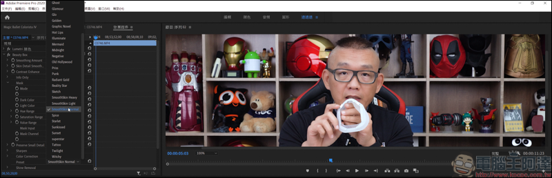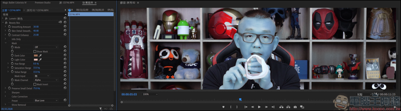 像這種直接變成阿凡達的預設也是有的,而且使用 Beauty Box 的優點是,即使你先上 Beauty Box 的特效,也不太會影響你的剪片速度 (以筆者CPU 3700X、32GB RAM、2070S為例),覺得不錯的話,Beauty Box 是還滿值得投資的一個特效外掛: