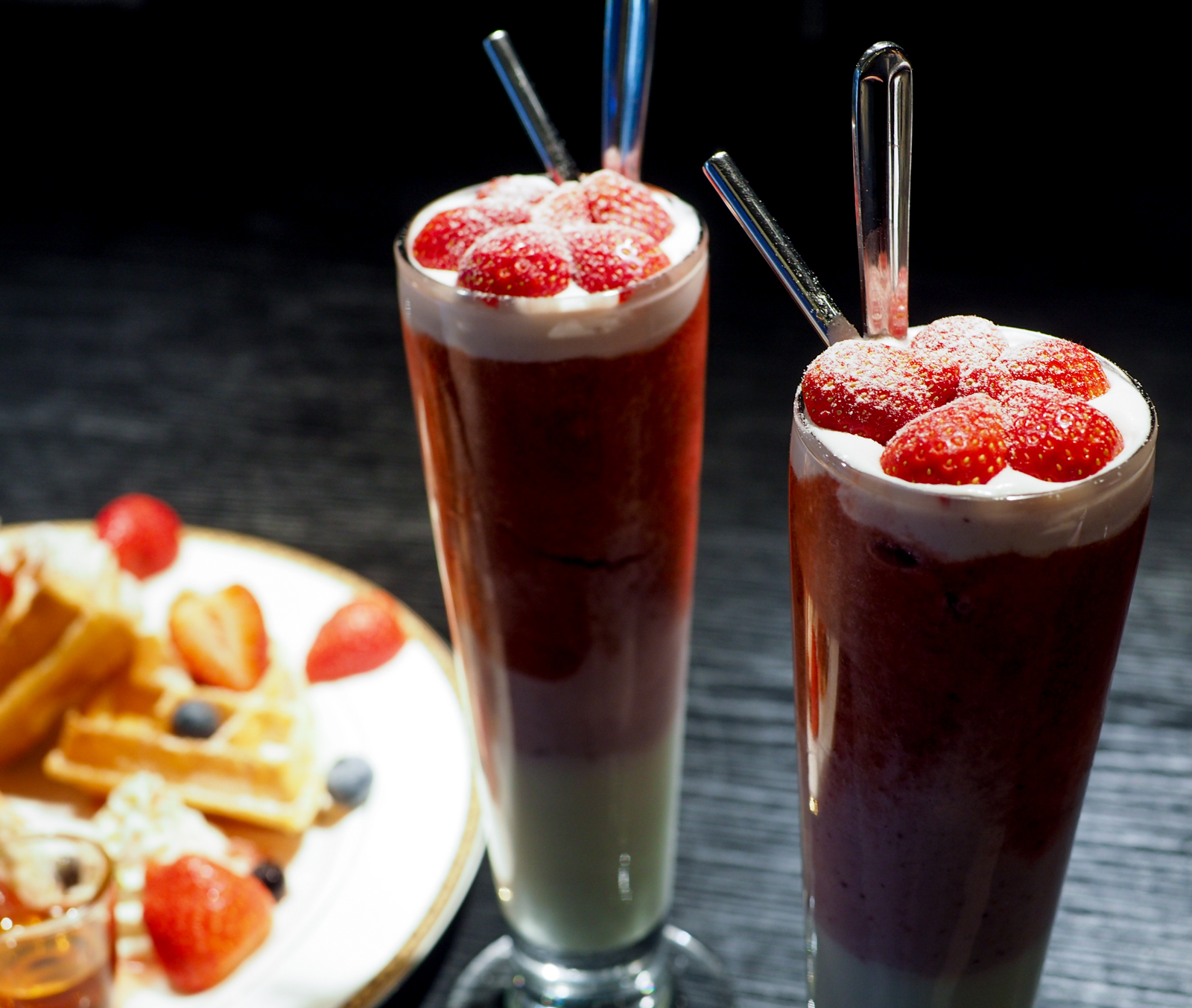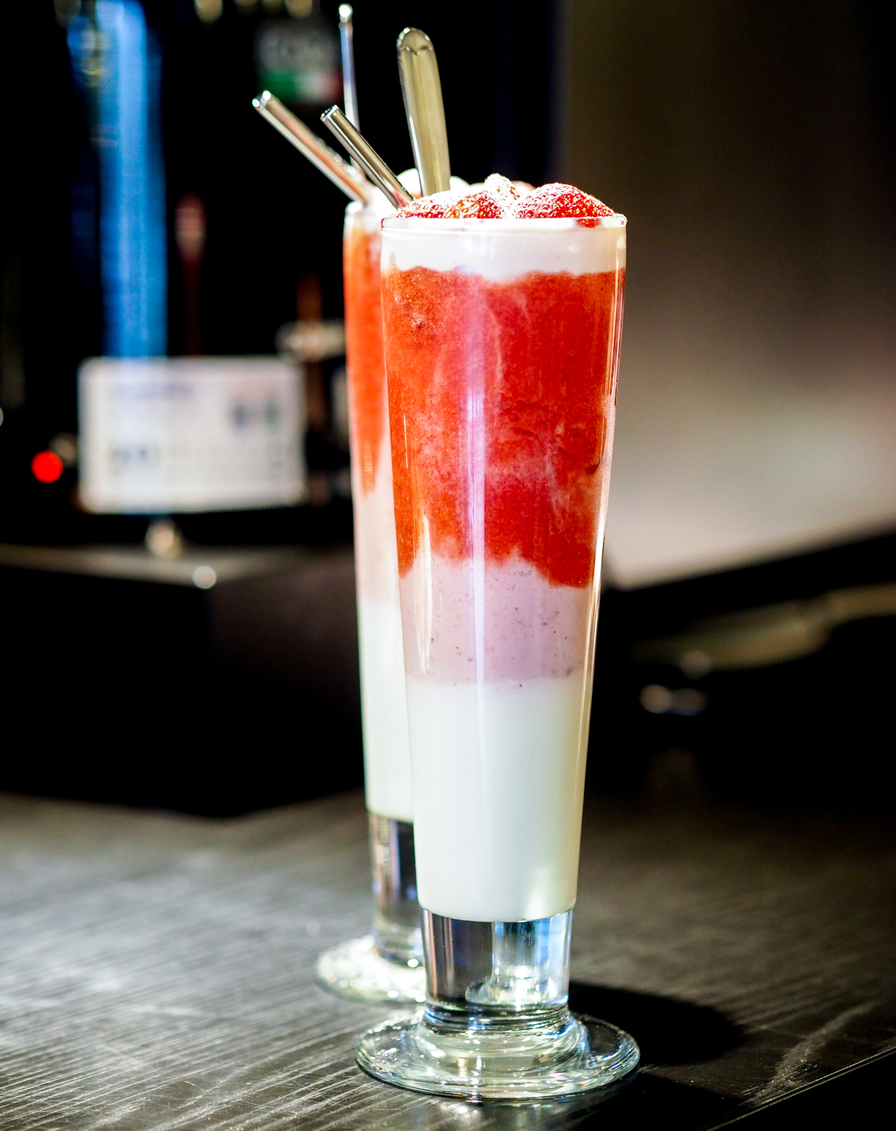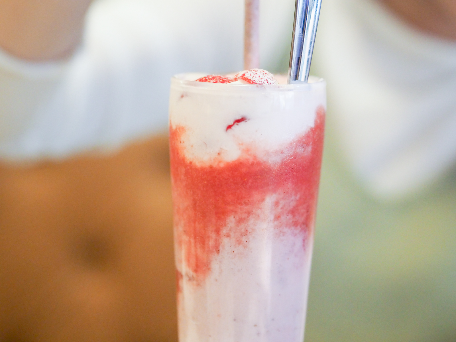 中間是草莓混合四葉牛奶、上層是草莓果粒冰沙,每一層都有不同滋味和口感