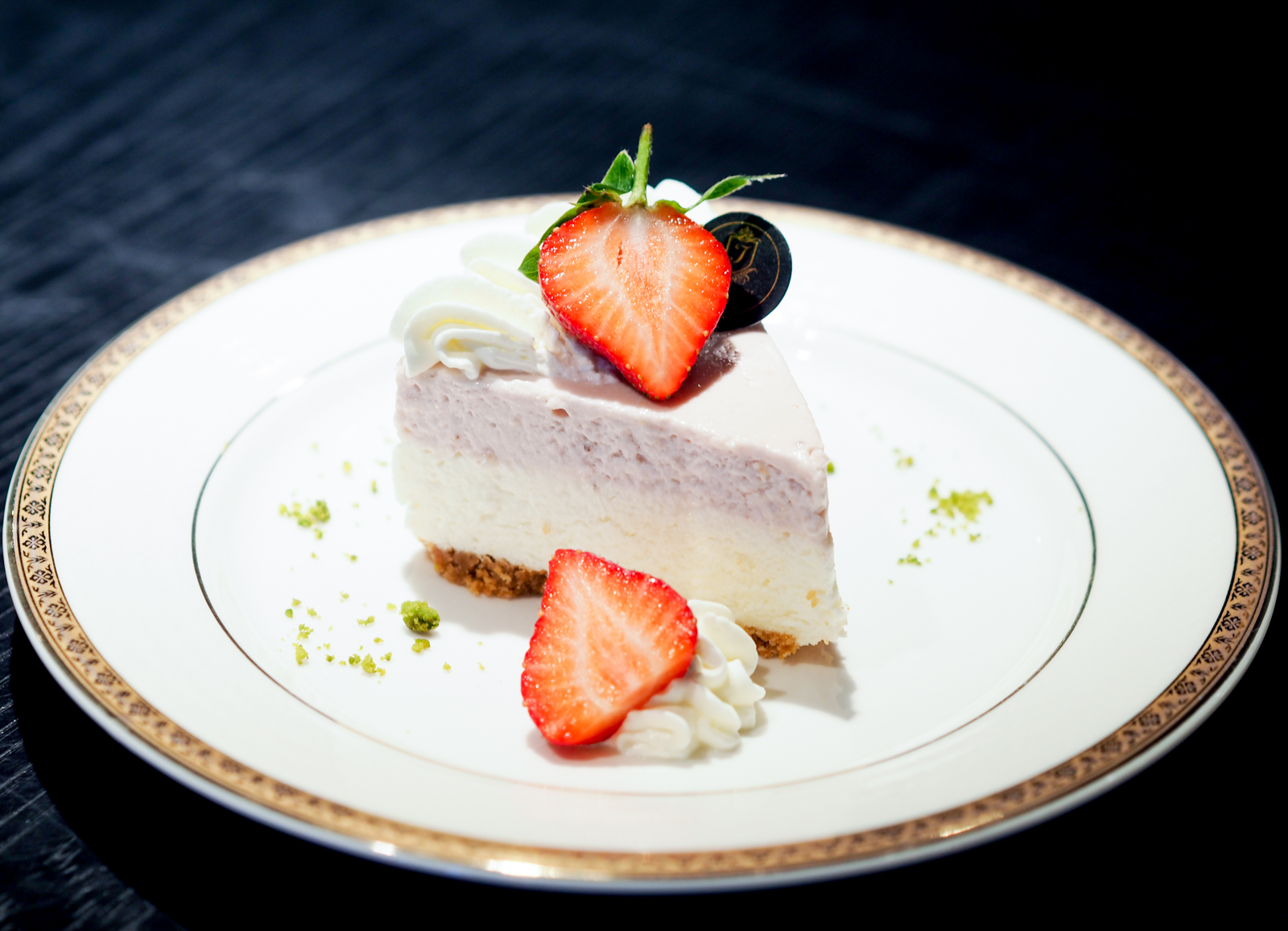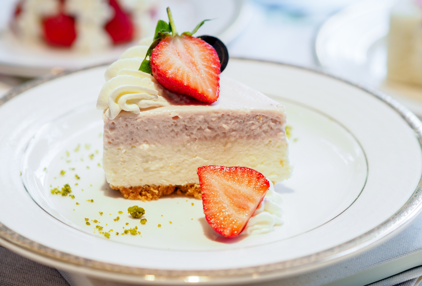 上面的生乳酪是新鮮草莓醬製成的,下層則是奶油口味乳酪,底下則是酥脆餅乾底