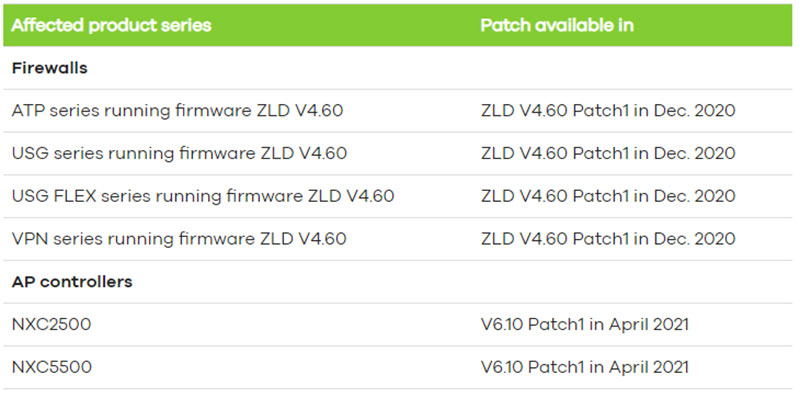 根據 Zyxel 的說法,目前 APT、USG、USG Flex 和 VPN 系列的修復更新已經釋出,至於 NXC 系列的修復則預計在 2021 年 4 月推出。Eye Control 表示在安裝該更新後可以刪除一個擁有設備 root 許可權的用戶名稱「zyfwp」,密碼為「PrOw!aN_fXp」的超級帳號。