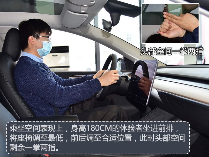 乘坐空間部分,汽車之家的測試者(身高 180 公分)坐在駕駛座將座椅調整至最低、前後調整至合適位置,此時頭部空間約剩下一個拳頭又兩個指頭:
