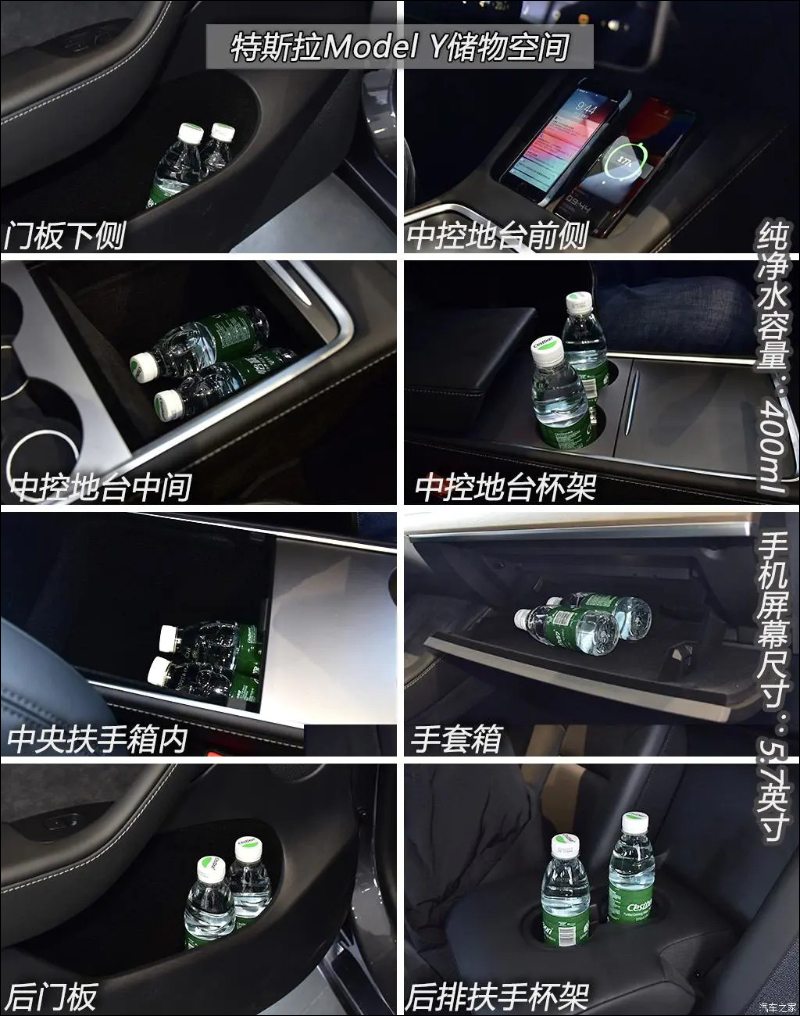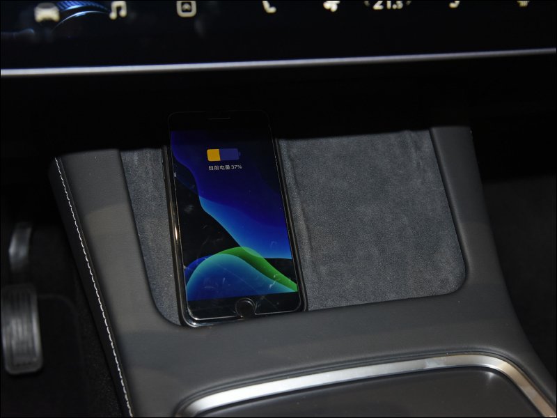 前方原本設置兩個有線的手機充電槽(支持 5W 充電功率),現在 Model Y 也替換成支持最高 7.5W 功率輸出的兩個無線充電板板,無線充電區域表面也採用翻毛皮材質增添質感: