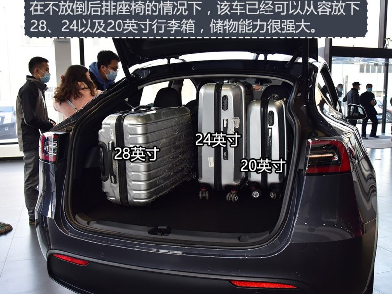在不放倒後排座椅的前提下, Model Y 已經可收納一個 28 吋行李箱、一個 24 吋的行李箱以及一個 20 吋的登機箱,對於一個小家庭的出遊已經相當夠用。