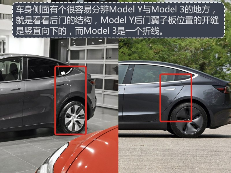 有許多人說 Model Y 就像是「長高」的 Model 3 ,然而除了能透過車身線條辨識外,其實從車身側面後門葉子板位置的車門開縫來分辨:
