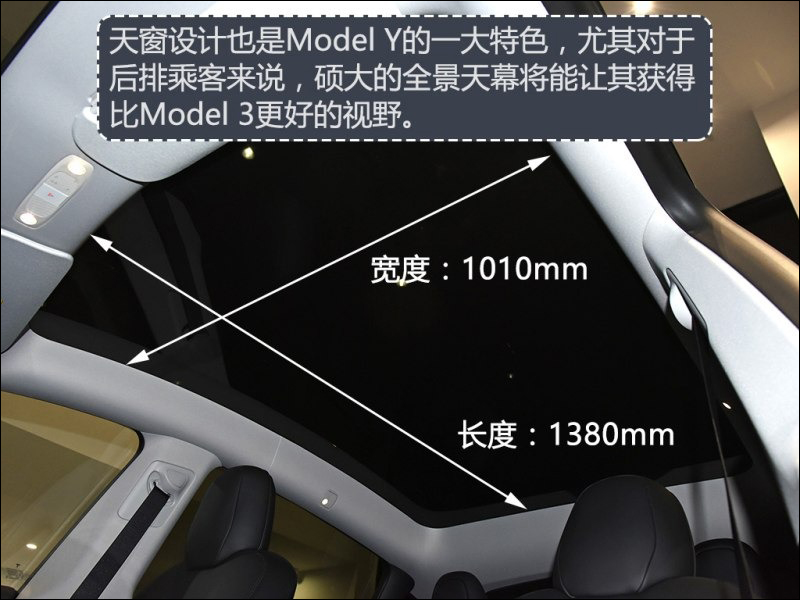 另外, Model Y 採用全景玻璃車頂也讓整體,不過因為取消了中間橫樑設計讓碩大的玻璃車頂更遼闊、視野更好。