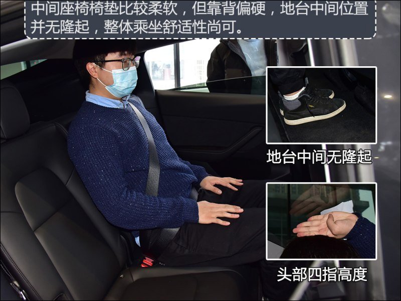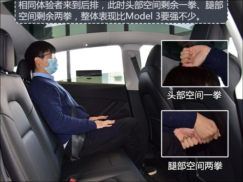接著同位測試者坐在 Model Y 的後座,此時頭部空間剩餘一個拳頭、膝部空間還有兩個拳頭,整體空間比起 Model 3 大許多。