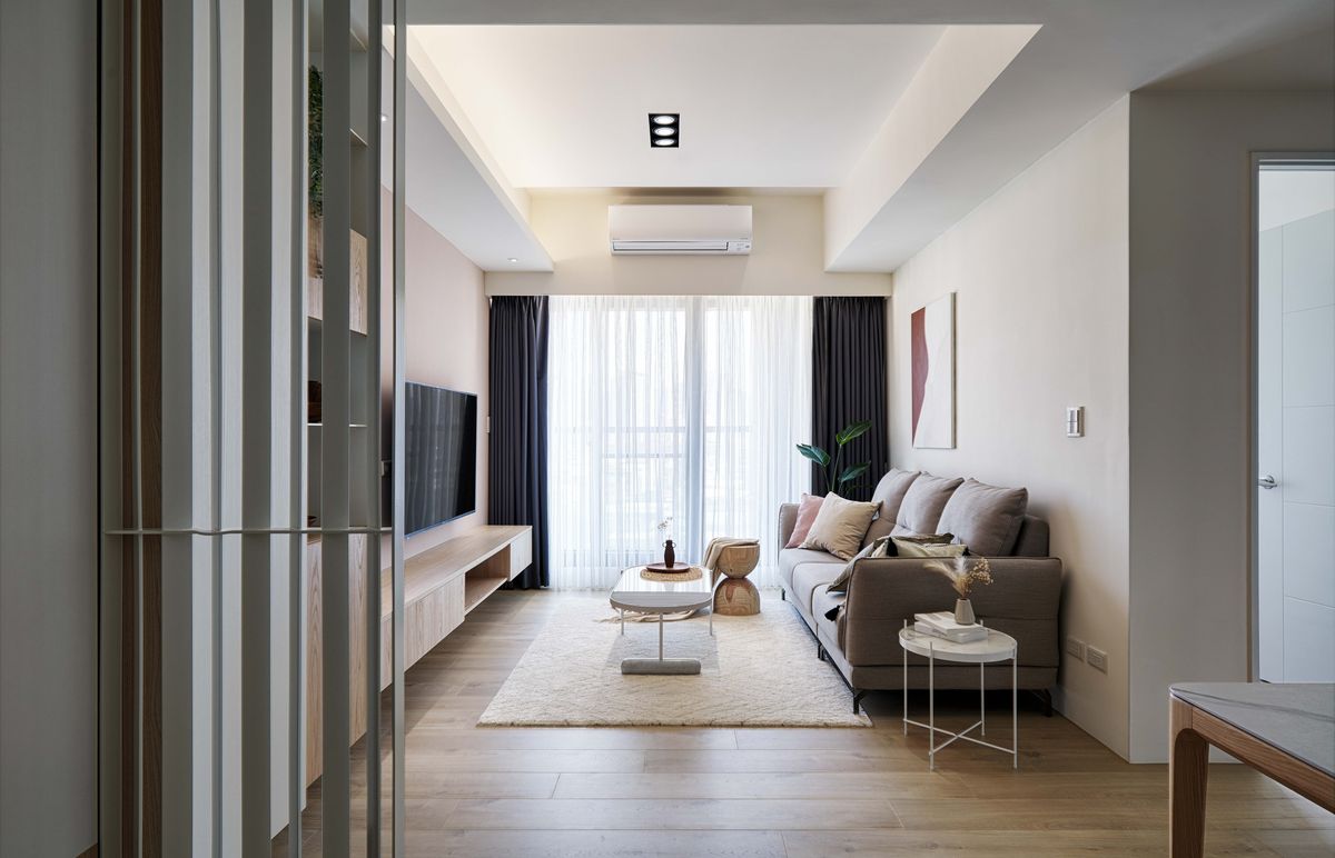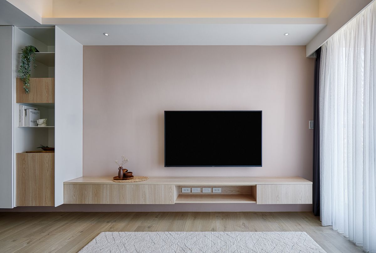 客廳電視牆漆上粉橘色,這也是女主人偏愛的色調,在一旁大片落地玻璃窗引入明亮光線的襯托下,散發出溫馨柔和的居家氣息,即使未來歷經歲月洗禮,都依然會是一片百看不膩的美好風景。