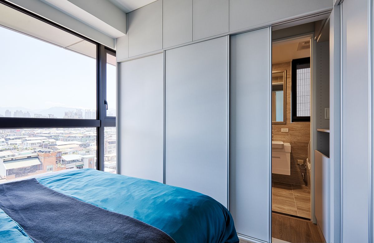 值得一提的是,設計師將主臥衣櫃門與浴室門做一體化結合,並更改為滑門裝置,在有限空間中也能簡便使用,且更衣室面積也獲得進一步提升,而衣櫃內也加裝穿衣鏡,可視需求自由拉出使用或隱藏,與一旁可居高臨下俯瞰城市景象的大片窗相映成趣,於是透過設計,原本平凡單純的生活也從此別具意義。