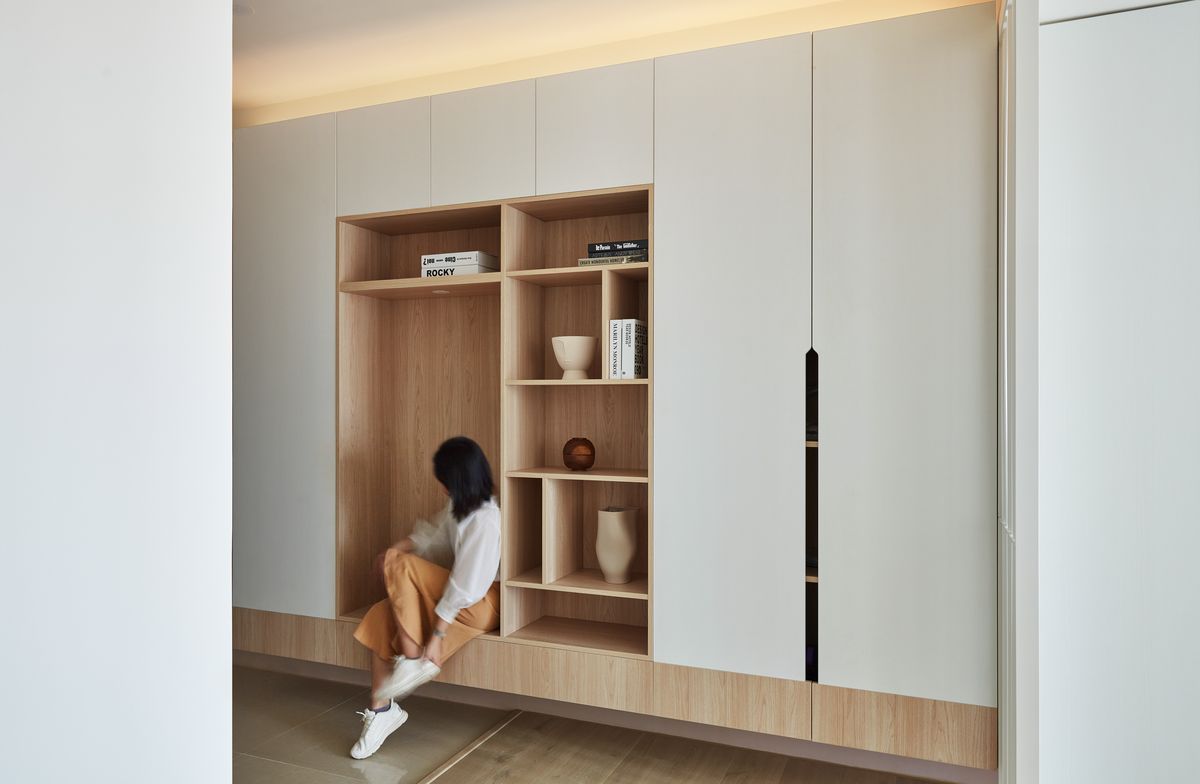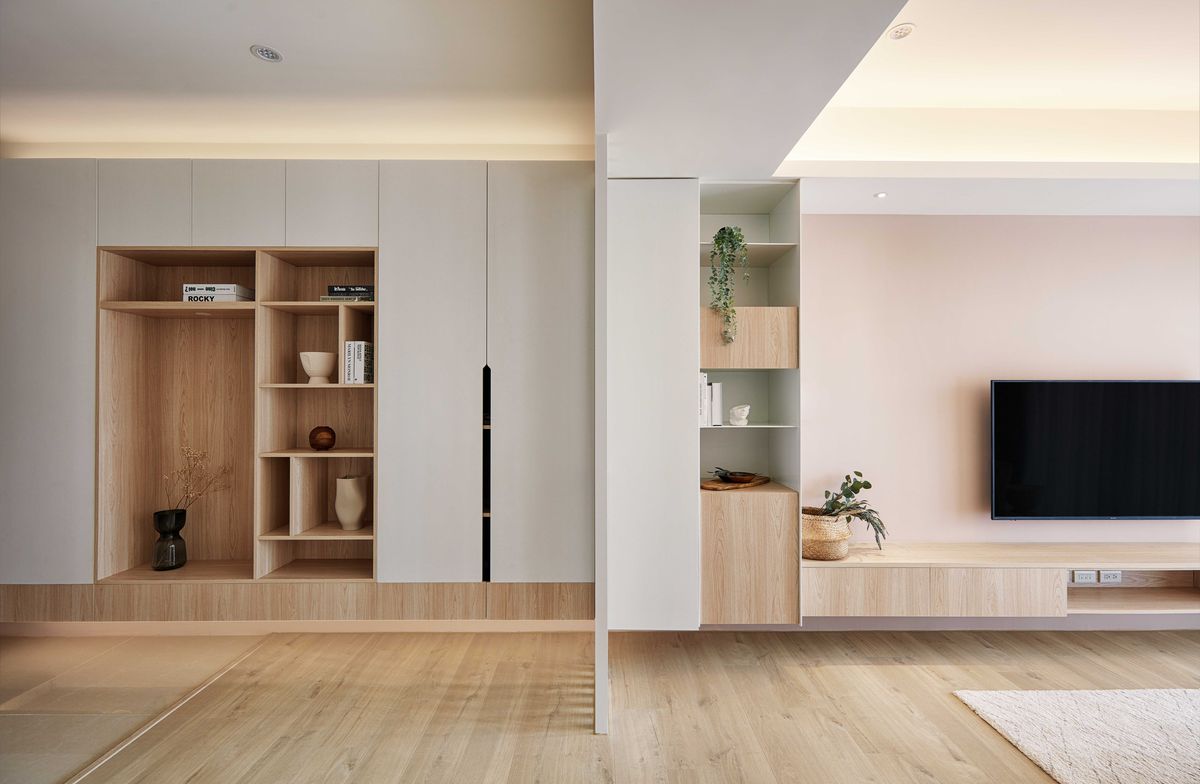 入門玄關落塵區舖設磁磚,不僅易於清潔整理,也藉此與公領域做出區隔,保有獨立功能性。一旁的收納櫃則將尺寸拉到最大,一路延伸至客廳,順勢強化儲物效用,同時櫃體中央規劃開放式展示架與中空座位區,可容納兩人一起坐著穿鞋。另外櫃體下方為懸空設計,包含客廳電視櫃也採用相同設計方式,目的在於能夠輕鬆擺放脫鞋或放置掃地機器人等家電設備,並防止灰塵堆積,也間接形塑輕盈穿透的視覺感。