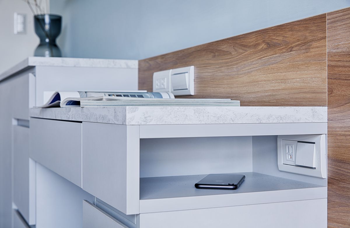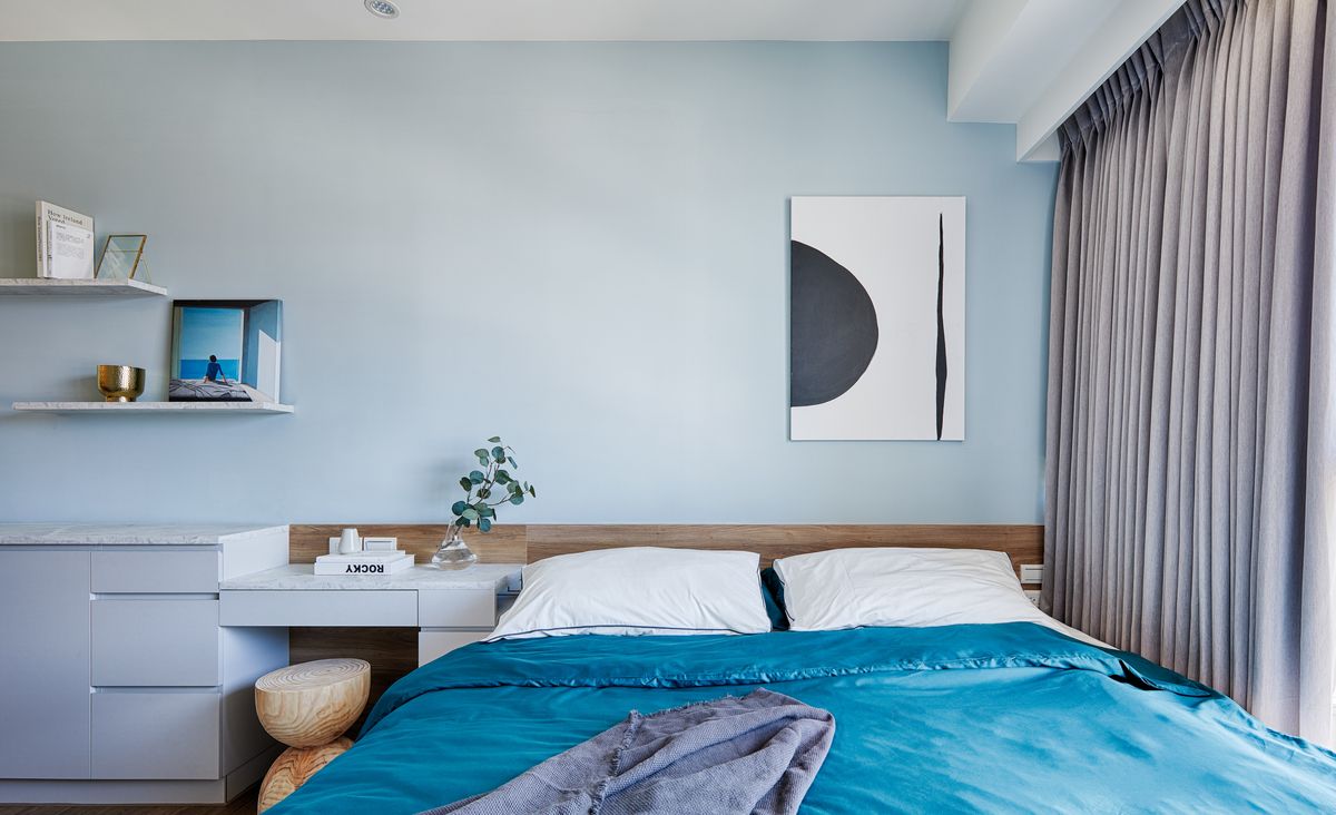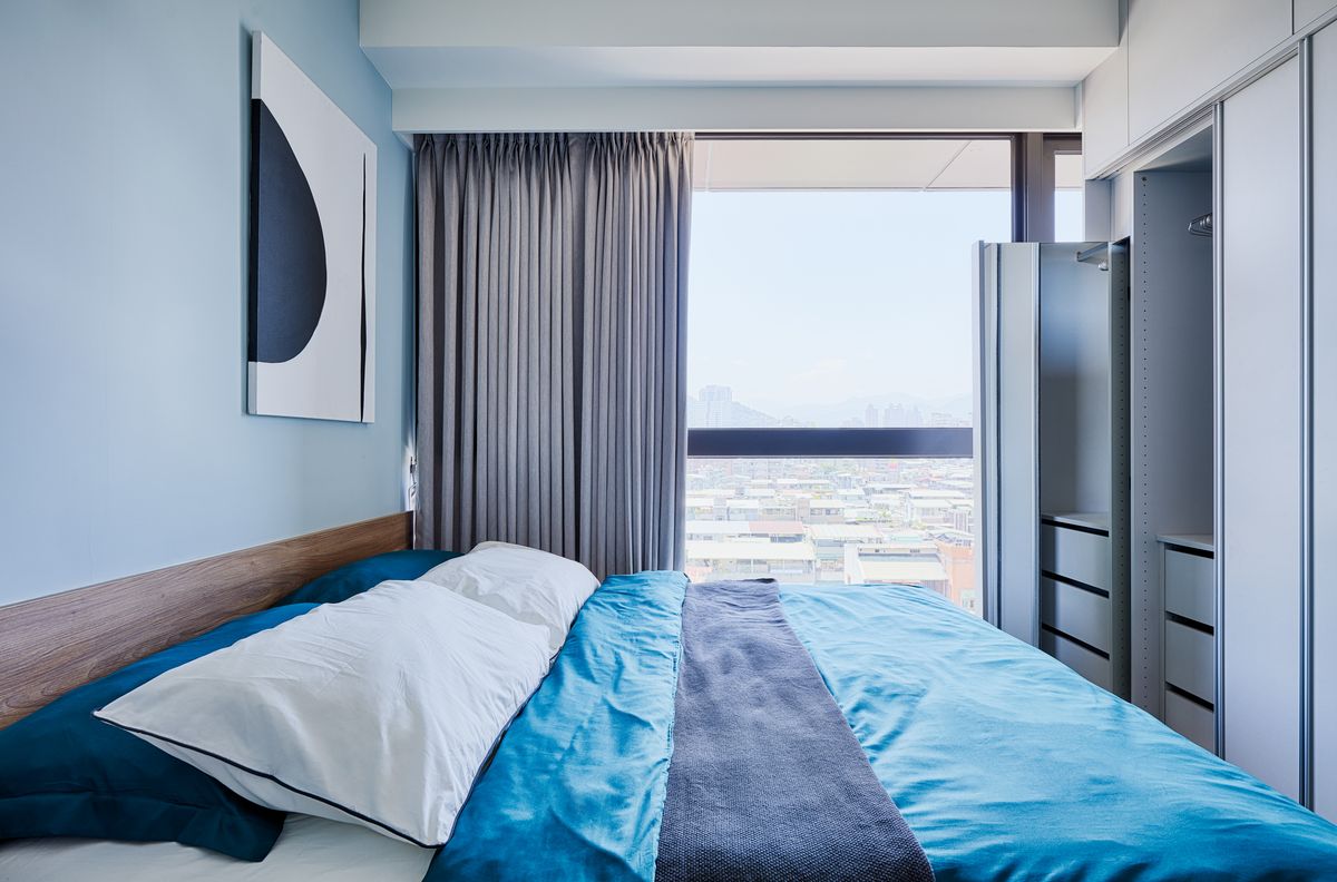 主臥室位在客廳後方,有別於客廳風格以女主人意見為準,主臥室則充分彰顯男主人的個性,床頭牆面塗上整片淺藍色,並點綴以木皮,傳達出層次立體的視覺張力,化妝台安置於床頭,臨床處規劃一座內凹平台,裡面設置插座與控制房間主燈的開關,床頭另一邊也同樣設有主燈開關及插座,方便使用者替3C設備充電及自由控制房間明暗程度,貼心程度令人讚嘆。