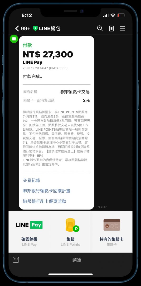 完成訂單之後即可送出資料,由於使用聯邦賴點卡會同步於 Line,因此 Line 錢包就會跳出刷卡通知,本次購買新版 M1版本的 Mac Mini 原價為27900元,透過教育優惠價只要27300,並且因為聯邦賴點卡有2%回饋,因此最終價格只要 27300 – 546 = 26754元。