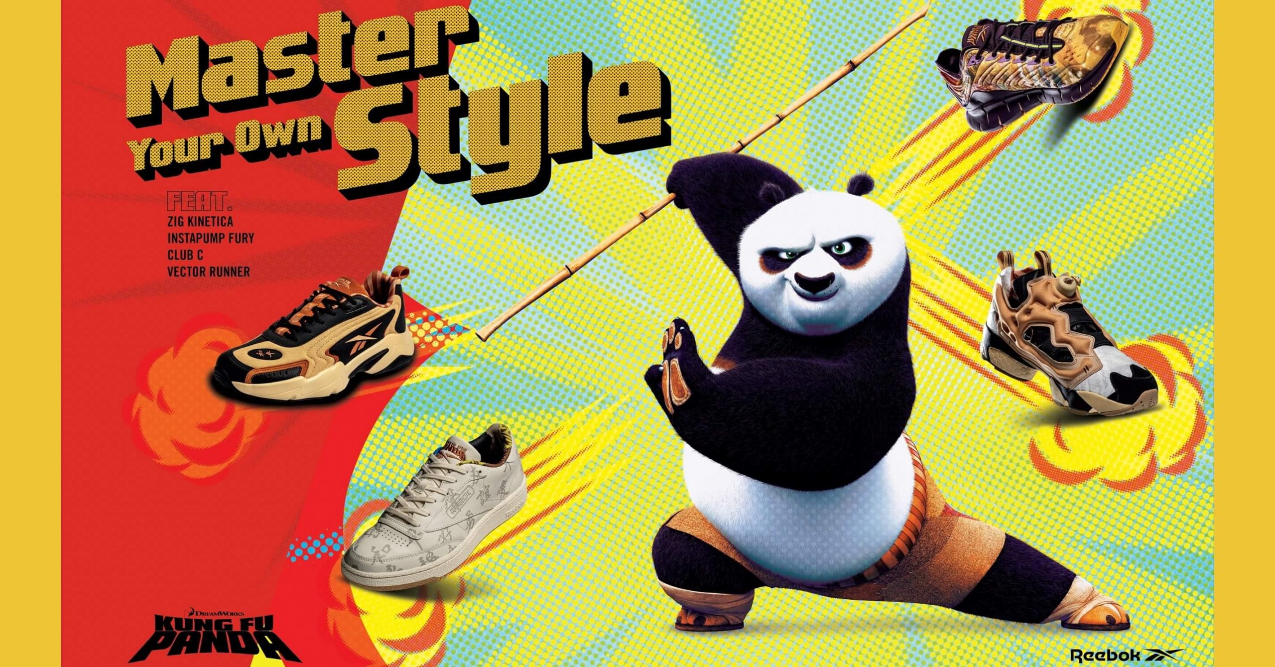 2021 年重磅首發,轟動武林的「神龍大俠」駕到!繼《小小兵》黃色旋風後,Reebok 攜手高人氣動畫電影《功夫熊貓》,打造 Reebok x Kung Fu Panda 全新力作。《功夫熊貓》於 2008 年在美國首映,是一部以功夫為主題的動畫電影,講述一隻笨拙的熊貓阿波 (PO) 立志成為武林高手的故事,富有寓意的情節與對白,上映後在全球掀起熱潮,陸續推出三集皆創下破億美元票房,影迷們更引頸期盼第四集的到來。Reebok 敢作例外、為自由而生,擅長大玩跨界創意,搶先與功夫熊貓聯名合作,以「友誼」為主題,將電影裡的經典角色色系與東方意象,巧妙融入 Reebok 經典的 PUMP、CLUB C、ZIG 鞋款與服飾,同步推出 PUMP 與 CLUB C 童鞋,並設計專屬紅色鞋盒與包裝襯紙,讓人眼睛為之一亮,藉由武林至尊號召大家一起在新的一年 Master Your Own Style。