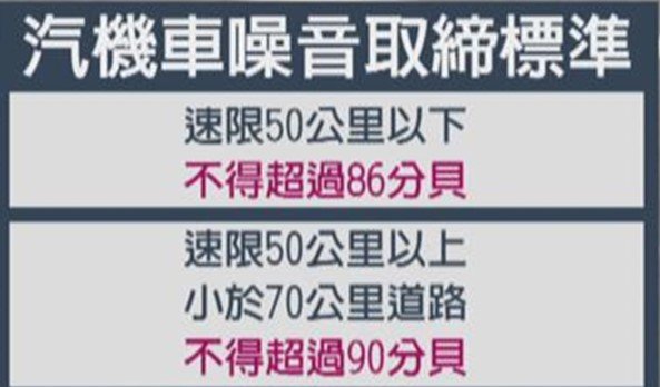 開罰的標準為:速限50km/h路段,不得超過86分貝;速限50~70km/h路段,不得超過90分貝。至於速限70km/h以上路段,大多離人口密集處較遠,噪音影響相對小,目前未納入「聲音拍照」科技執法範圍。只要噪音超標,不當操駕的超標車輛將以《噪音管制法》開罰1800至3600元罰鍰,不當改造車輛也將限期改