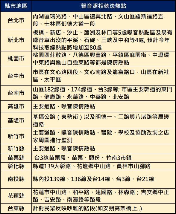 以下針對環保署「聲音照相」執法的方式與全台執法熱點地段做一整理: