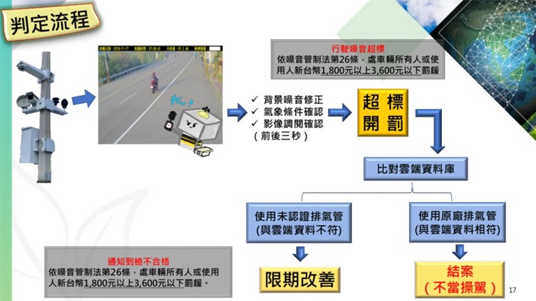 若行車產生的噪音超標,各地環保局就會根據噪音管制法第26條以不當操駕進行開罰;若從照片中辨認使用非原廠或認證排氣管等違法改裝者,地方環保局將再要求到檢與限期改善。