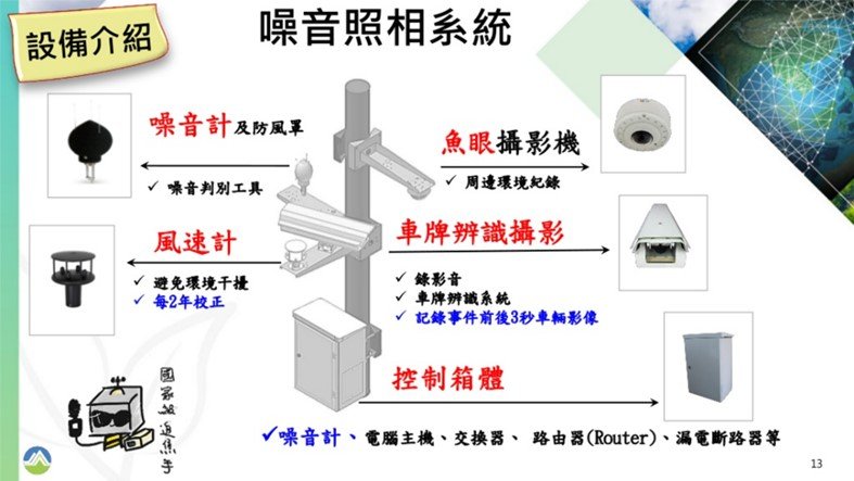 環保署表示目前35套「聲音照相」系統已經在2021年元旦於18個縣市正式上路。「聲音照相」系統分成「固定式高噪音車輛偵測攝影系統」與「移動式聲音照相系統」,前者主要固定架設在民眾陳情熱區之特定路段設置以長期監視取締;後者則採非定時、非定點,於民眾常陳情噪音車輛出沒之熱區,執行機動性聲音照相取締工作。