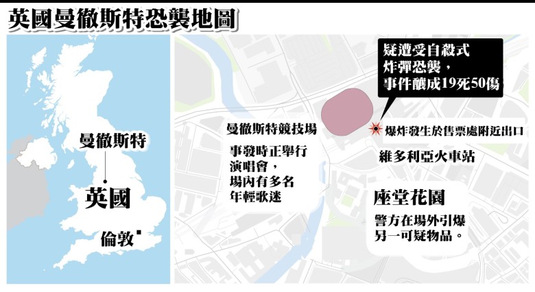 美國女歌手Ariana Grande周一晚於英國曼徹斯特競技場舉行演唱會後,場地發生連環爆炸,疑是自殺式炸彈恐襲,至少22人死亡59人受傷。下個月英國將舉行大選,而兩個月前英國國會也遭受恐襲,懷疑事件起因與英國大選有關。