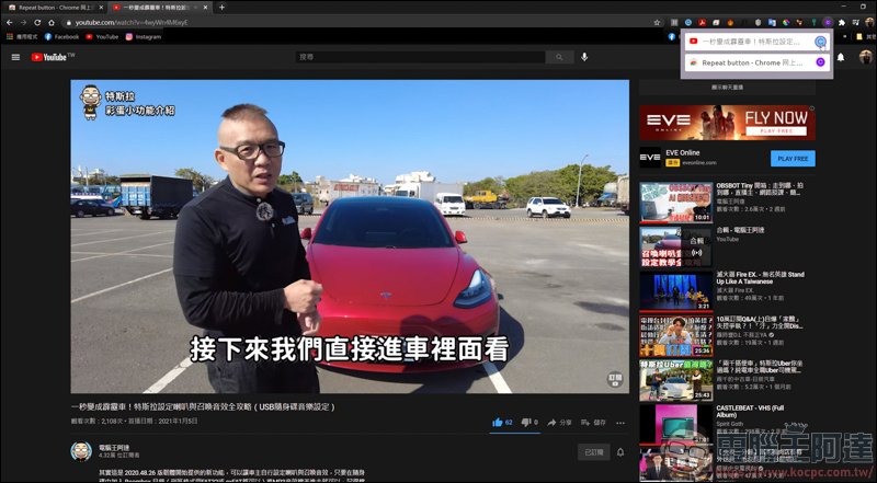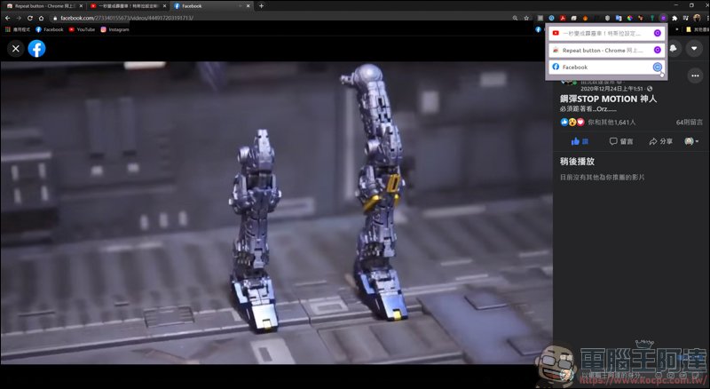 安裝完 Repeat button 後,在右上的插件裡就能看到 Repeat button ,首先測試 Youtube,只要點開 Repeat button ,就能看到目前的分頁,點一下 Youtube 頁面旁的重複撥放按鈕,就會不斷的播放該影片(Ps. Youtube 只要點滑鼠右鍵就能重複播放):