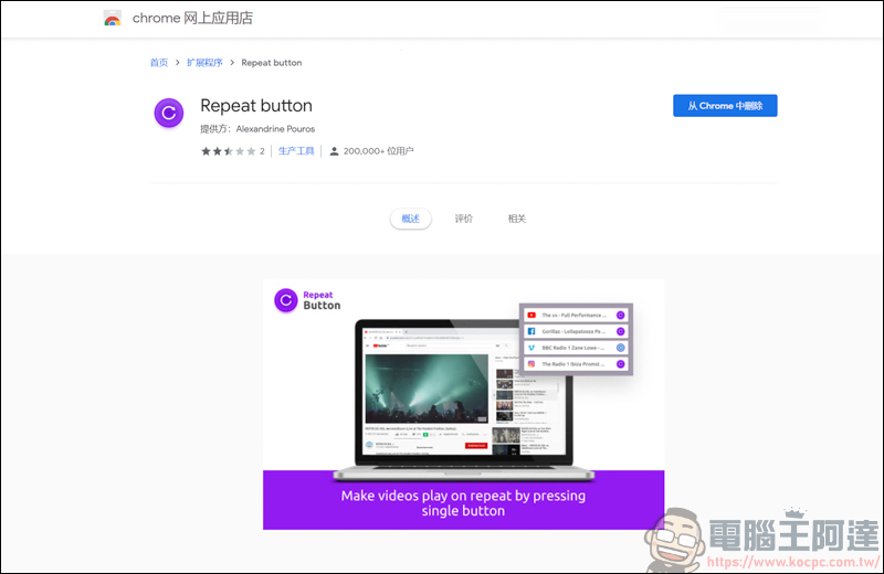 這次介紹 Chrome 插件 「Repeat button」,是一個非常非常非常簡單的插件,只要安裝它,在觀看 FB、Youtube 時,點一下「Repeat button」,就會自動重複播放了!不需要再另外掛其它網頁或在網址輸入文字就能自動重複播放,雖然 Youtube 影片按右鍵就能重複播放,但「Repeat button」卻能在一些熱門視頻網站和 HTML5 的視頻做循環播放,甚至一些...老司機你懂得!