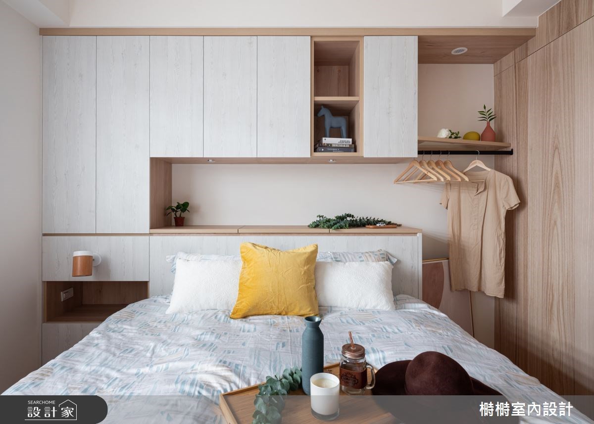 不大的臥室空間所需要大量的衣物收納時,貼牆設計整面的衣櫃,藉由局部開放格櫃設計搭配吊掛機能,活用牆面的每一寸空間來收納衣物。