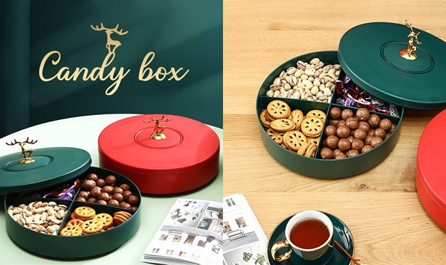 這款零食盒上方的金色麋鹿提把,配上紅色或綠色的零食盒,給人濃厚的聖誕氣氛!下方的底盤還可以旋轉,長輩朋友來訪時,大家要拿取零食更方便!