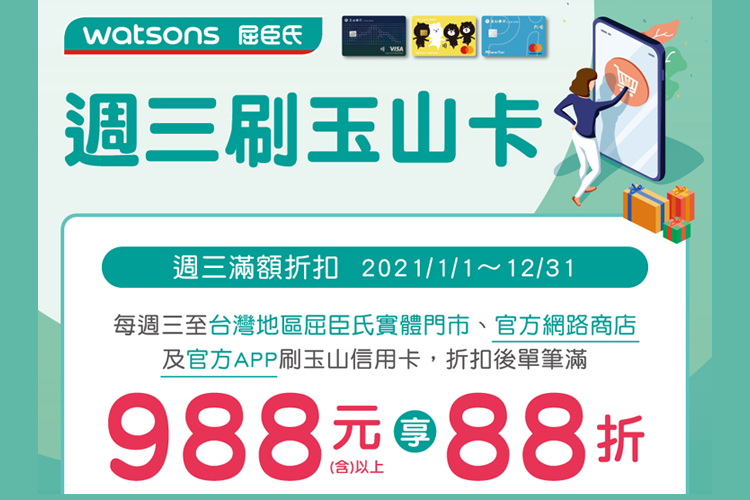 活動期間內,持王山銀行信用卡於屈臣氏實體門市、官方網路商店及官方APP刷卡消費,折扣後單筆滿988元享88折。