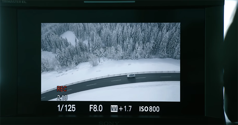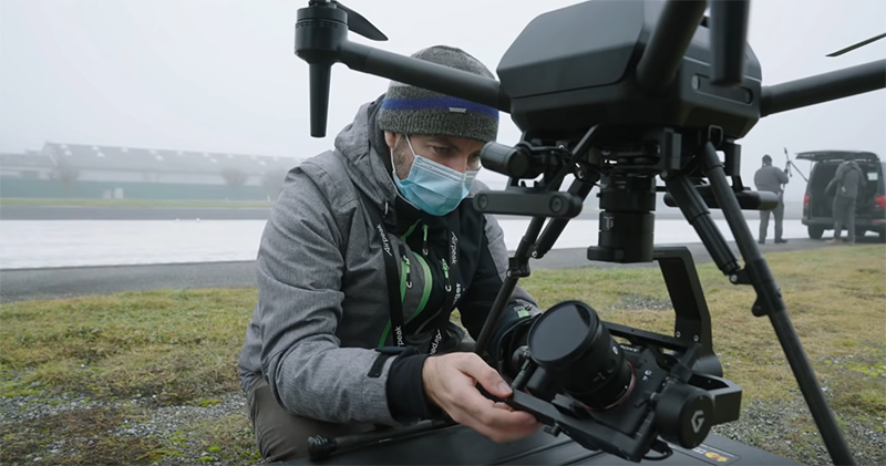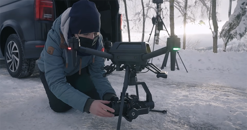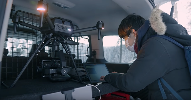 重點是這電池單顆看起來感覺都快要跟一台相機差不多大了... 相信足夠的電量應該可以給予創作者相當好的滯空創作餘裕。特別選在對電力與抗風都相對嚴苛的冰天雪地下拍攝,想必也是在展示 Airpeak 發表時強調的艱困環境拍攝實力吧。