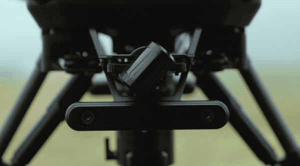 針對實境的部分,影片裡可以看到疑似支援雙人遙控的畫面,上圖除了展示了疑似具備 3D 場景辨識的視覺避障系統(目前看來四面都有這個長條形的雙鏡頭模組),更有著一般小型空拍機使用的三軸攝影鏡頭。這應該是為了飛手所準備的攝影機。