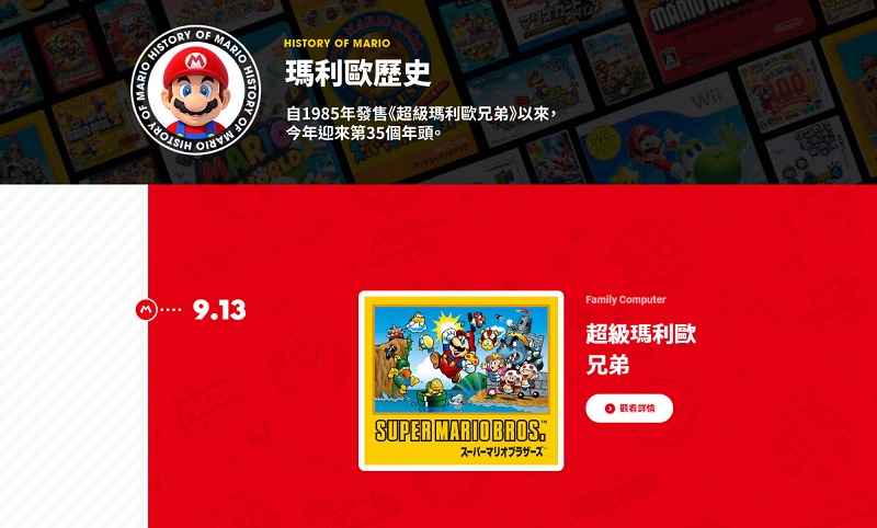 在「超級瑪利歐兄弟 35週年」活動資訊網站內,能夠看到2021年1月~3月期間的35週年最新活動資訊,及超級瑪利歐兄弟的歷史年表等。